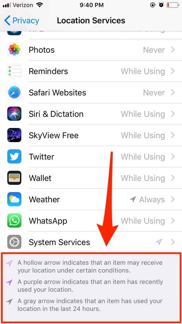 A hollow arrow indicates that an item may receive your location under certain conditions A purple arrow indicates that an item has recently used your location. IOS 11 hollow arrow and system location services. The hollow arrow will show up the rest of the time and indicates one or more of your apps will use your location under certain conditions possibly Geo fences for certain apps or other uses.